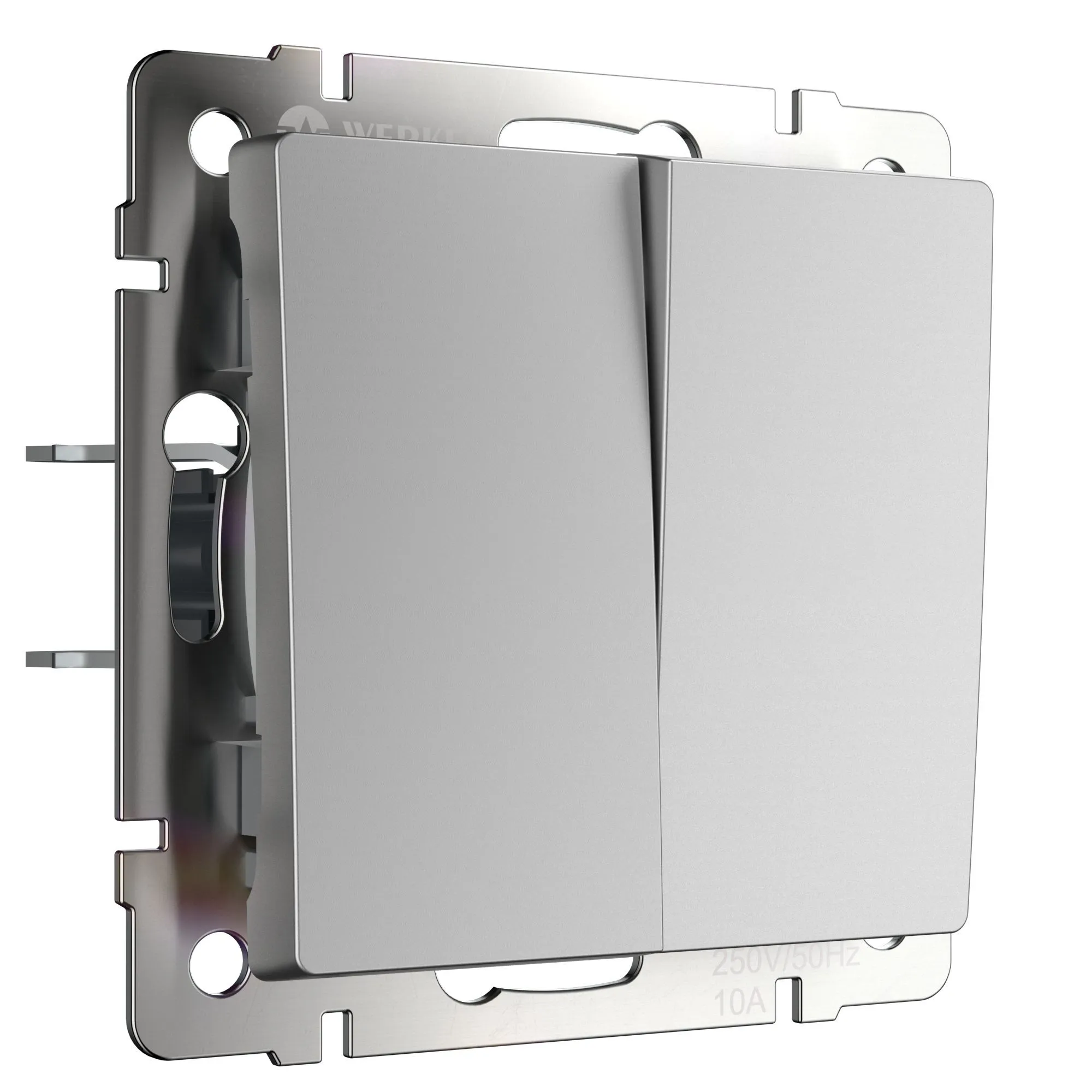Выключатель двухклавишный серебряный W1120006 рассчитан на 10А и 250В - представляет собой механизм нажимного типа с металлическим суппортом и декоративными накладками. Он устанавливается в монтажную коробку, оставляя видимыми только лицевую панель и накладную рамку.